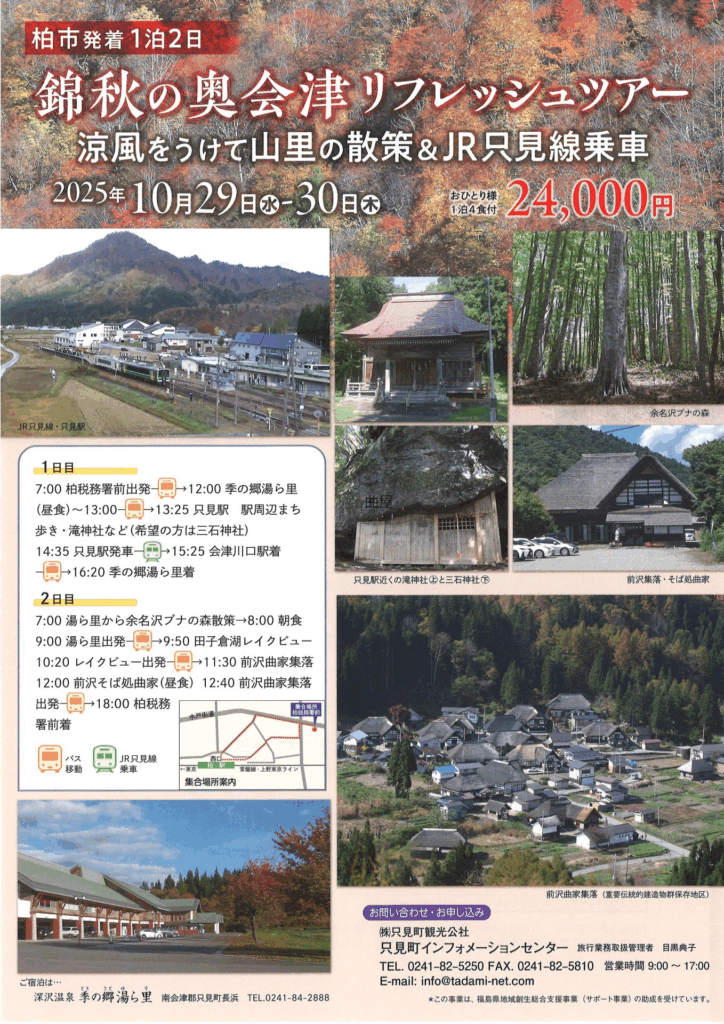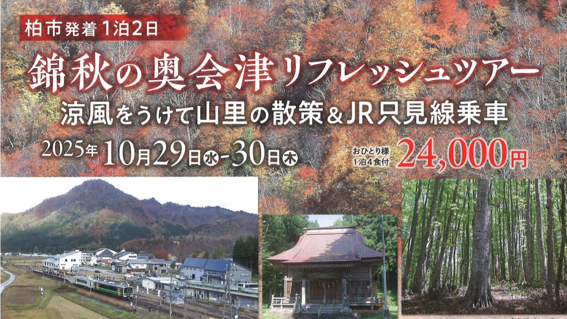 只見町は、柏市と【ふるさと交流都市】の提携をしております。例年「雪まつり」等のイベントに多くの皆さまにおいでいただいておりますが、今回は「錦秋の奥会津リフレッシュツアー」と題しまして、奥会津の雄大で荘厳な秋の大自然を満喫していただくツアーを企画いたしました。柏市発「1泊2日」柏市帰着のバスツアーです。