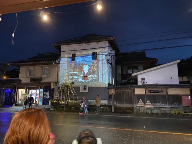 地元幼児のクリスマスの作品を国権酒造さんの壁面に投影します♪ ▼前回のイベントの模様