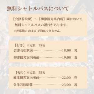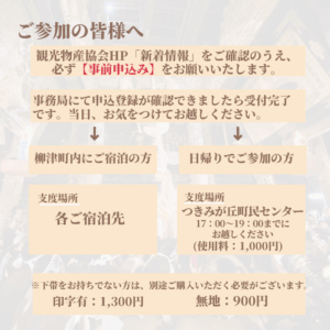 - 当日柳津町内でご宿泊の方は各宿泊施設へ、当日ご宿泊をされない方は町民センターへお越しください。(※1)
