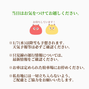 当日は降雪や路面凍結も大いに予想されますので、必ず「冬タイヤ」でお越しくださいますようお願い申し上げます。