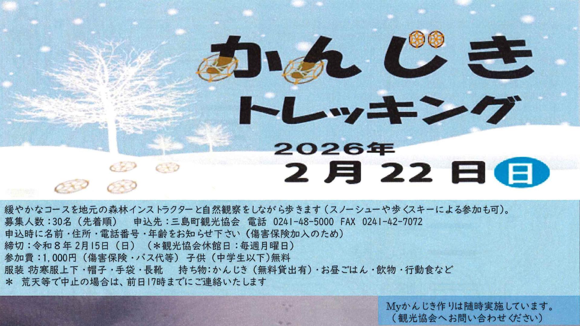 三島町 2026.01.22 する 三島町 【三島町】かんじきトレッキング開催! 開催日 :2月22日(日曜日)会場 :三島町間方地区参加費 :1,000円定員 :30名(先着順)申し込み先:三島町観光協会 電話:0241-48-5000 前の記事へ 奥会津伝言板 TOP 次の記事へ