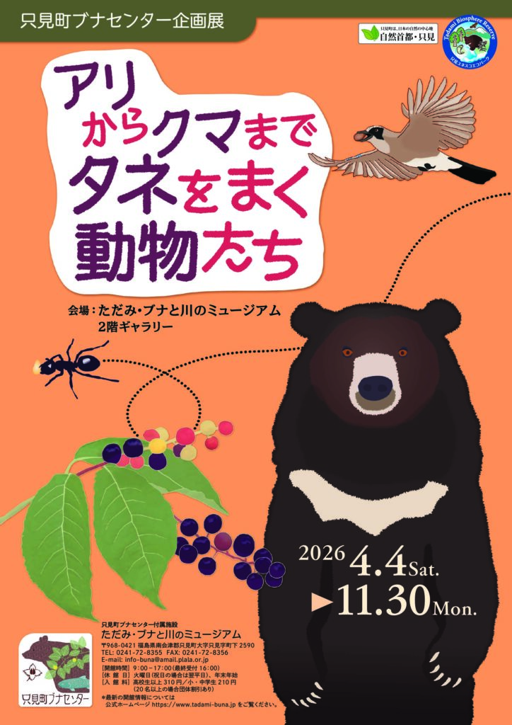 ただみ・ブナと川のミュージアムでは、4月より新しい企画展として「アリからクマまで-タネをまく動物たち-」を開催します。