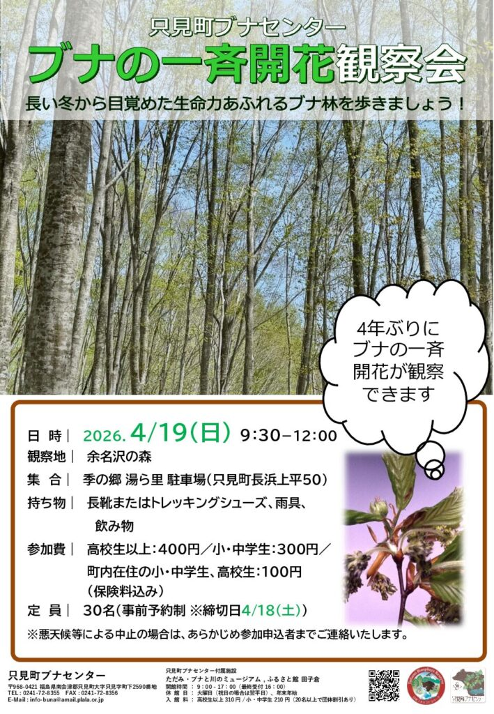 只見町ブナセンターでは春のイベントとして、4年ぶりの開花を迎えるかもしれないブナの林を見る観察会を、4月19日に開催する予定です。今年も4月19日に余名沢の森を歩き、そこで見られるブナや各種動植物について、指導員が解説します。