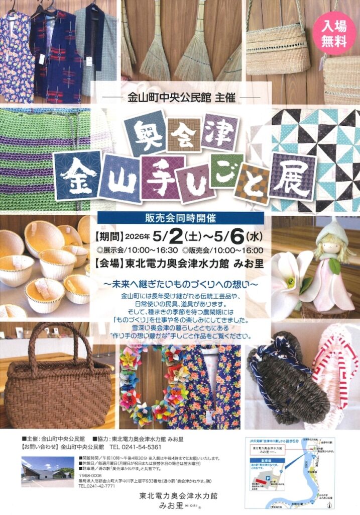 東北電力奥会津水力館みお里にて、ゴールデンウィーク期間中の5月2日(土曜日)から6日(水曜日)まで5日間、金山町中央公民館主催「奥会津金山 手しごと展」(展示・販売会)が開催されます。