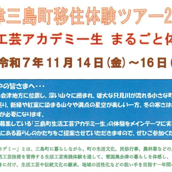 HOME 奥会津で探す 検索結果 KEYWORD TAGS 選択をリセット 柳津町 三島町 金山町 昭和村 只見町 南会津町 檜枝岐村 みる よむ する かう 伝言板 ATM あわまんじゅう いわな お土産 お寺 お知らせ お祭り お菓子 お蕎麦 からむし からむし織り こんにゃく じゅうねん せど森の宴 ゆべし アイス アウトドア アクティビティ アート イベント エゴマ カフェ カメラ カヤック カレー ガソリンスタンド キャンプ キャンプ場 クラフトビール グルメ ケーキ ゲストハウス ゲートボール コーヒー スイーツ スキー スキー場 スノーボード スーパーマーケット セミナー ソースカツ丼 ダム テレワーク ハイキング バーベキュー パン屋 ピザ フェス ホームセンター ホール ポケモン マルシェ ラーメン ワークショップ 一棟貸し 七夕列車 三島地鶏 会津地鶏 会津木綿 会社 伝統 伝統工芸 伝統工芸品 伝統文化 体験 体験ツアー 健康 公共施設 公園 写真スポット 加工場 博物館 古民家 只見川 只見線 只見駅 商店 喫茶店 地域産品 地蔵 夏 奥会津 奥会津全域 奥会津商店 学ぶ 定食屋 小学校 尾瀬 居酒屋 展望台 展示会 山椒 岩 峠 川 建造物 役場 手作り 文化 文化財 新潟県 施設 旅館 日本酒 映画 曲げわっぱ 木工 案内所 桐 橋 歌舞伎 正月 歴史 民泊 温泉 湖 湧き水 湿原 滝 炭酸水 炭酸泉 着物 神社 紅茶 紅葉 経木 絶景 編み組み細工 美術館 自然 自然体験 自然景観 花火大会 茅葺 蕎麦 薬局 街コン 裁ちそば 見学ツアー 観光協会 観光案内所 観光物産協会 豆腐 赤べこ 赤カボチャ 足湯 道の駅 郵便局 重要文化財 釣り 銀行 集落 雑貨 霧幻峡 霧幻峡の渡し 風景 食堂 飲食店 餅 駅 タグ一覧を折りたたむ 体験ツアー 【昭和村】博士峠 ブナの巨木めぐり日帰りバスツアー 2025.09.29 みる体験ツアー昭和村 【柳津町】秋の只見線チョイ乗り体験ツアー 2025.09.26 体験ツアー柳津町 【三島町】移住体験ツアー 2025年秋 2025.09.25 三島町体験ツアー 【只見町】錦秋の奥会津リフレッシュツアーのご案内 2025.09.14 体験ツアー只見町 【柳津町】福満虚空蔵菩薩圓藏寺「福が満ちる御祈祷・朝粥・お宝特別… 2025.09.09 体験ツアー柳津町 【只見町】移住体験ツアー参加者募集 2025.07.17 体験ツアー只見町